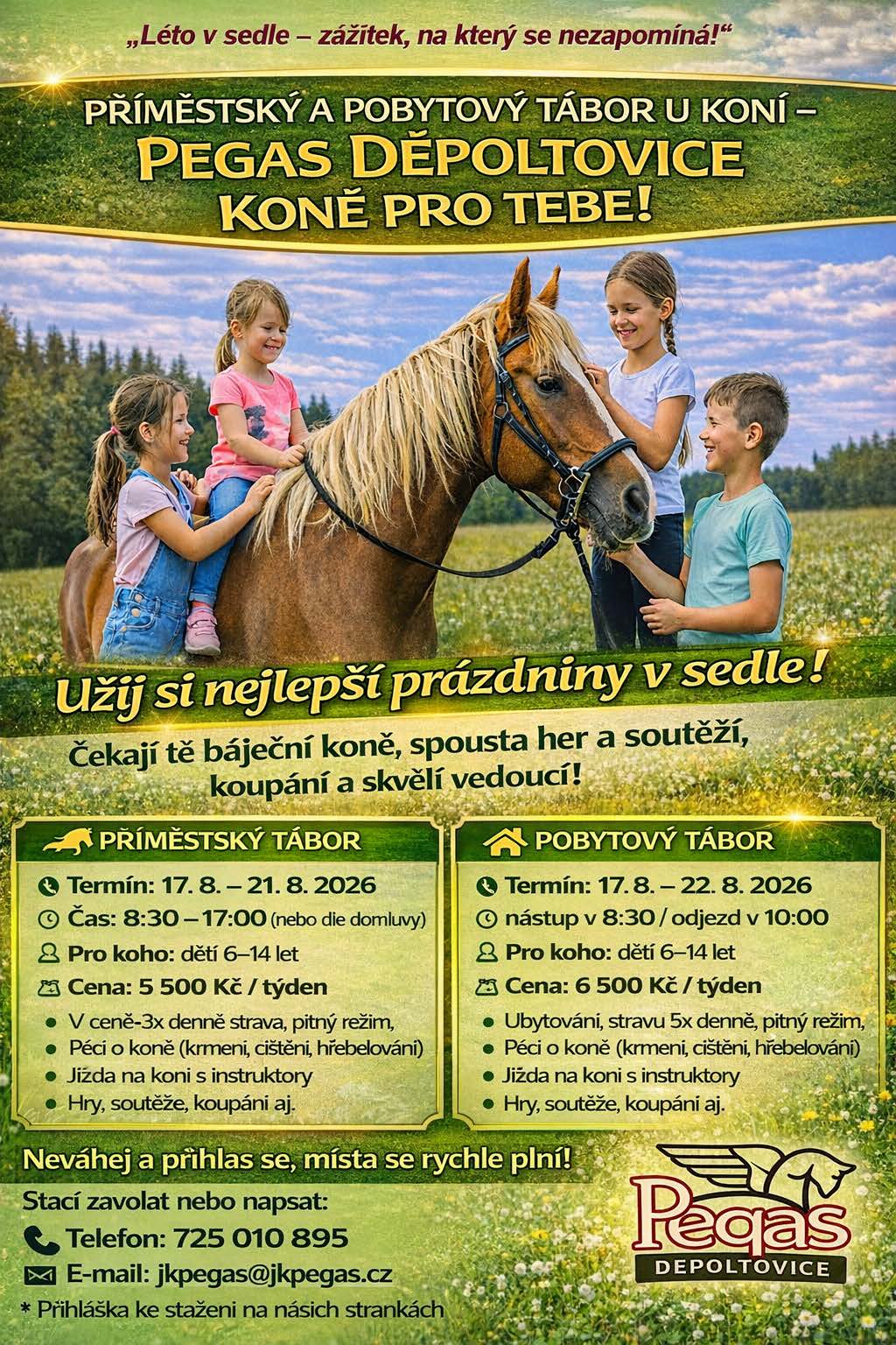 V sobotu 10.05.2025 od 16:00 hod se koná v areálu Pegasu Děpoltovice Běh rodičů s dětmi „Po stopách jezdectví“. Je to skvělá příležitost, jak aktivně strávit odpoledne s dětmi a dozvědět se něco o jezdectví. Celou akcí nás bude provázet DJ KUBA. Na závěr s diskotékou. Přijďte se pobavit. Tato akce je vhodná pro děti od 2 let. Máme dvě trasy 0,3 km a 0,6 km. Nic náročného. Těšíme se na Vás